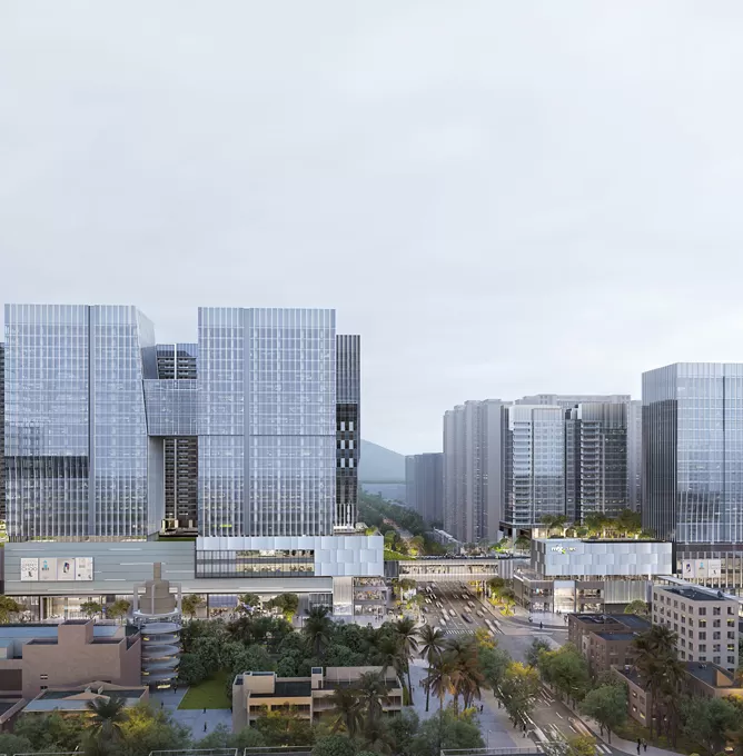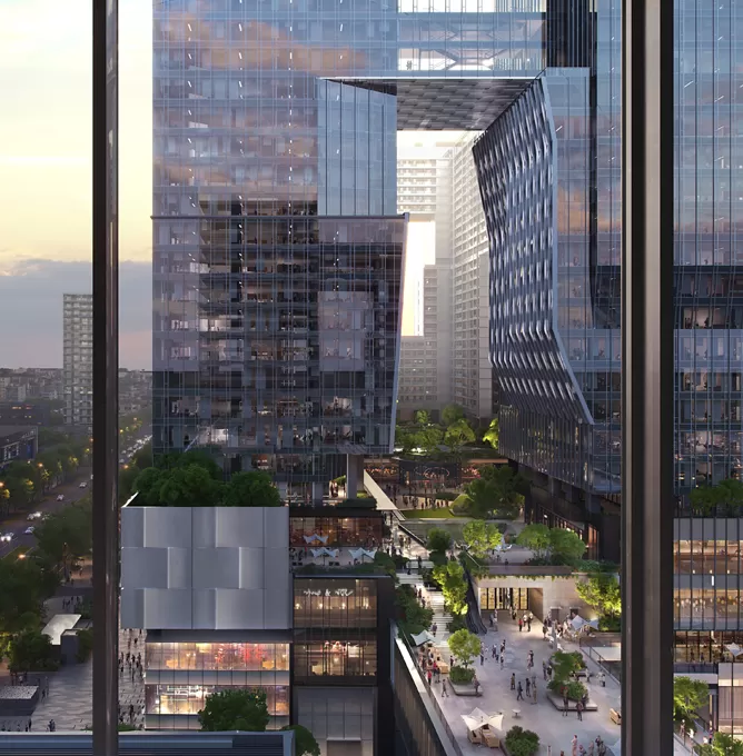 We supplied over 150,000㎡ of facade and architectural systems across the entire development, including: