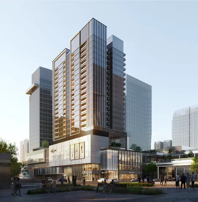 Glass Curtain Wall: Unitized and stick systems applied to tower facades and podium levels, delivering transparency, energy efficiency, and a sleek appearance.
